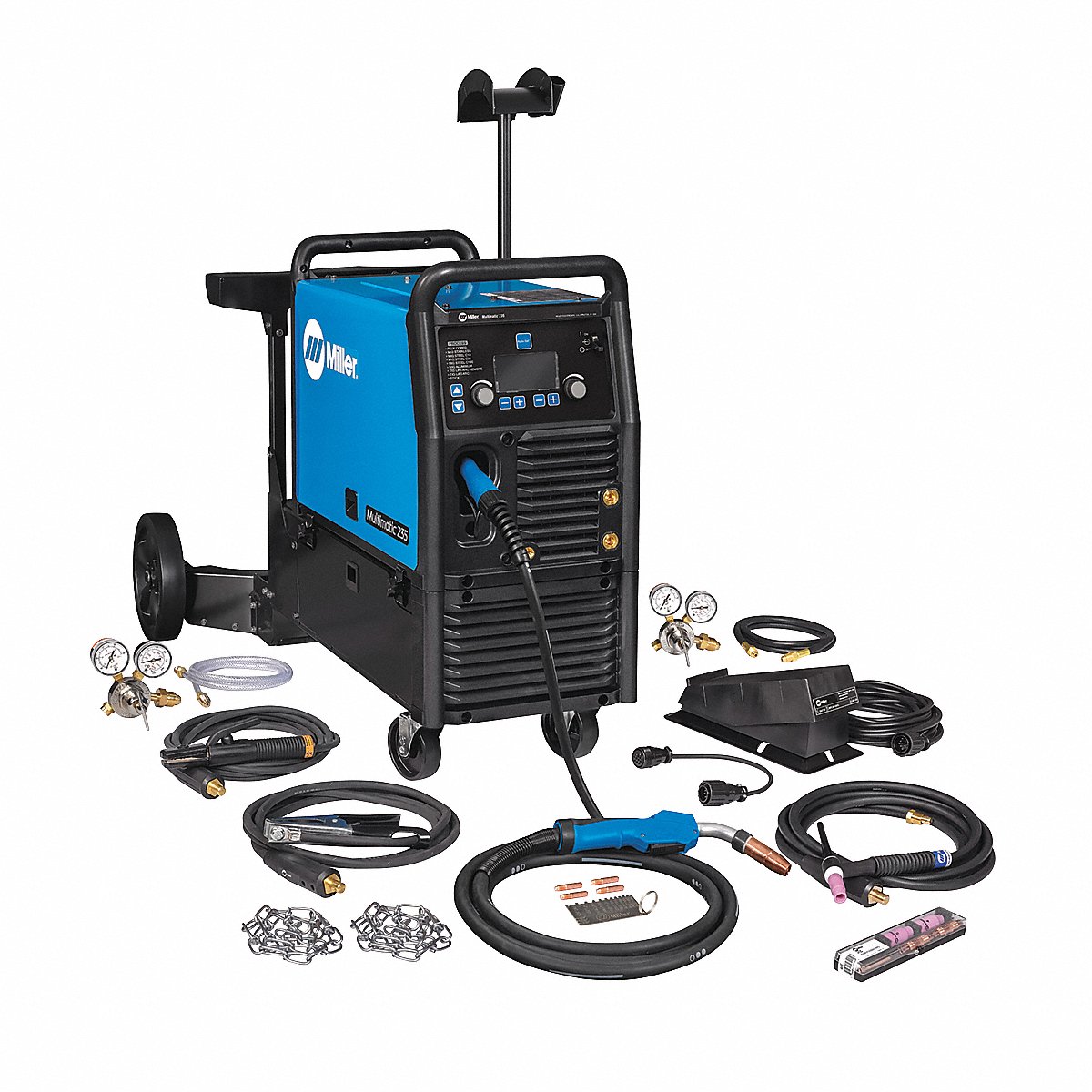 Kit Includes: TIG Torch, Contact Tips, Foot Control, Running Gear, Stick Electrode Holder with Cable, Flow Gauge/Regulator & Gas Hose, MIG Gun, Drive Rolls, Work Cable with Clamp