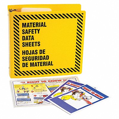Binder Language English Spanish Legend Material Safety Data Sheets/Hojas de Seguridad de Material Includes OSHA Haz Com Highlights Compliance Checklist RTK Spanish and English Books Mini RTK Poster with Key Haz Com Issues Clear Sheet Protector and A-Z Index Height 11-5/8 In. Width 11-5/8 In. Depth 3-3/4 In. Station Mounting Type Binder Only Binder Ring Size 3 In. Binder Color Yellow Binder Chain Included No