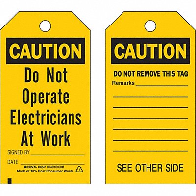 Caution Tag Material Polyester Legend Do Not Operate Electricians At Work Height 5-3/4 In. Width 3 In. Withstand Pull Force 50 lb. Hole Size 3/8 In. Header Caution Legend Color Black Background Color Yellow Legend Style Text Write on Surface Yes Package Quantity 10