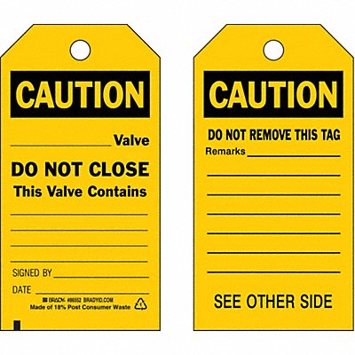 Legend/Background Color Black/Yellow Caution Tag Legend ___Valve Do Not Close This Valve Contains___ Reverse Side Legend Do Not Remove This Tag Remarks___ Height 5-3/4 In. Width 3 In. Hole Size 3/8 In. Grommet Material Metal Indoor/Outdoor Usage Indoor/Outdoor Tag Color Yellow Background Color Yellow Language English Shape Rectangle No of Ties Included 10 Write on Surface Yes Header Caution Withstand Pull Force 50 lb. Standards ANSI Z53.1-1967 ANSI Z535-2006 OSHA 1910.145