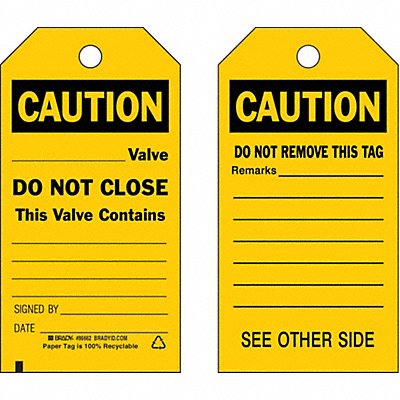 Legend/Background Color Black/Yellow Caution Tag Legend ___Valve Do Not Close This Valve Contains___ Reverse Side Legend Do Not Remove This Tag Remarks___ Height 5-3/4 In. Width 3 In. Hole Size 3/8 In. Indoor/Outdoor Usage Indoor Only Tag Color Yellow Background Color Yellow Language English Shape Rectangle No of Ties Included 100 Write on Surface Yes Header Caution Standards ANSI Z53.1-1967 ANSI Z535-2006 OSHA 1910.145 Includes (100) String Fasteners