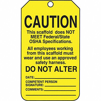 Legend/Background Color Black/Yellow Caution Tag Legend This Scaffold Does Not Meet Federal/State OSHA Specifications All Employees Working From This Scaffold Must Wear And Use An Approved Safety Harness. Do Not Alter Reverse Side Legend This Scaffold Does Not Meet Federal/State OSHA Specifications Height 5-7/8 In. Width 3-3/8 In. Hole Size 3/8 In. Grommet Material Metal Shape Rectangle Withstand Pull Force 50 lb. Tag Material Plastic Subject Matter Fall Protection