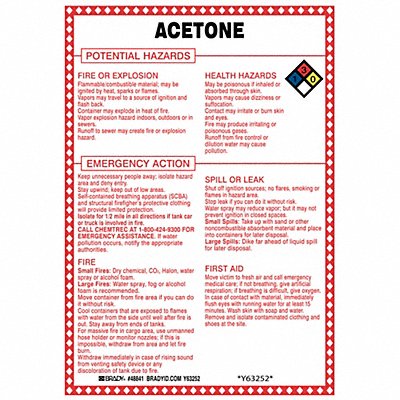 Chemical Sign Acetone Potential Hazards Fiberglass Height 10 In. Width 7 In. Header No Header Legend Style Symbol and Text Language English Mounting Style Surface Thickness 0.100 In. Sign Shape Rectangle Operating Temp Range -40 Degrees to 194 Degrees F Retroreflective Grade Not Retroreflective