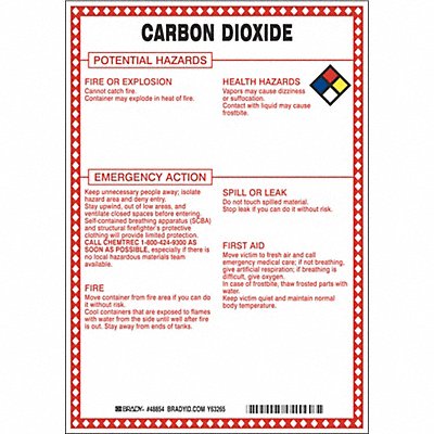 Chemical Sign Carbon Dioxide Potential Hazards Fiberglass Height 10 In. Width 7 In. Header No Header Legend Style Symbol and Text Language English Mounting Style Surface Thickness 0.100 In. Sign Shape Rectangle Operating Temp Range -40 Degrees to 194 Degrees F Retroreflective Grade Not Retroreflective