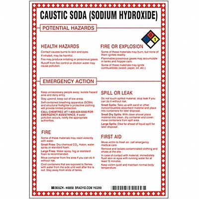 Chemical Sign Caustic Soda (Sodium Hydroxide) Potential Hazards Fiberglass Height 10 In. Width 7 In. Header No Header Legend Style Symbol and Text Language English Mounting Style Surface Thickness 0.100 In. Sign Shape Rectangle Operating Temp Range -40 Degrees to 194 Degrees F Retroreflective Grade Not Retroreflective