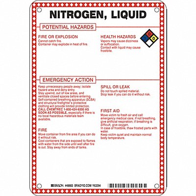 Chemical Sign Nitrogen Liquid Potential Hazards Fiberglass Height 10 In. Width 7 In. Header No Header Legend Style Symbol and Text Language English Mounting Style Surface Thickness 0.100 In. Sign Shape Rectangle Operating Temp Range -40 Degrees to 194 Degrees F Retroreflective Grade Not Retroreflective