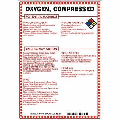 Chemical Sign Oxygen Compressed Potential Hazards Fiberglass Height 10 In. Width 7 In. Header No Header Legend Style Symbol and Text Language English Mounting Style Surface Thickness 0.100 In. Sign Shape Rectangle Operating Temp Range -40 Degrees to 194 Degrees F Retroreflective Grade Not Retroreflective