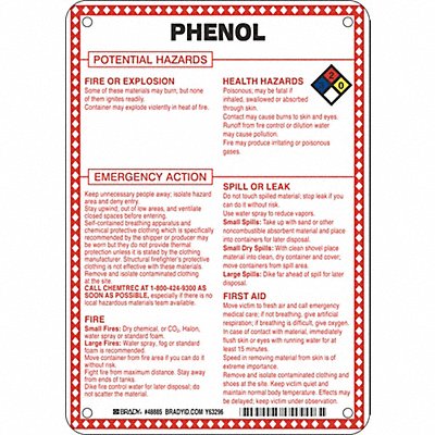 Chemical Sign Phenol Potential Hazards Fiberglass Height 10 In. Width 7 In. Header No Header Legend Style Symbol and Text Language English Mounting Style Surface Thickness 0.100 In. Sign Shape Rectangle Operating Temp Range -40 Degrees to 194 Degrees F Retroreflective Grade Not Retroreflective