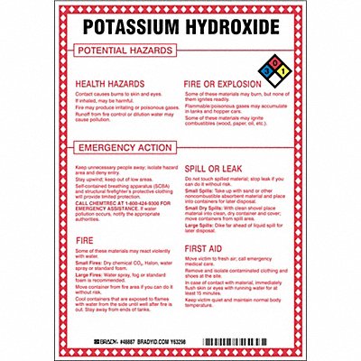 Chemical Sign Potassium Hydroxide Potential Hazards Fiberglass Height 10 In. Width 7 In. Header No Header Legend Style Symbol and Text Language English Mounting Style Surface Thickness 0.100 In. Sign Shape Rectangle Operating Temp Range -40 Degrees to 194 Degrees F Retroreflective Grade Not Retroreflective