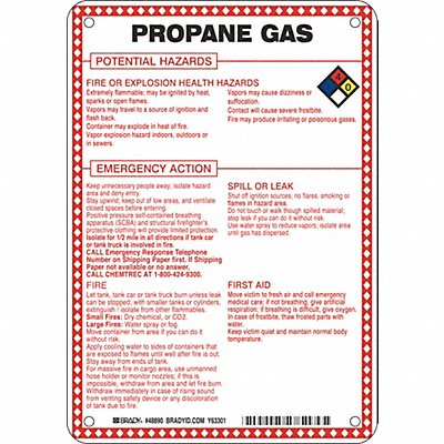 Chemical Sign Propane Gas Potential Hazards Fiberglass Height 10 In. Width 7 In. Header No Header Legend Style Symbol and Text Language English Mounting Style Surface Thickness 0.100 In. Sign Shape Rectangle Operating Temp Range -40 Degrees to 194 Degrees F Retroreflective Grade Not Retroreflective