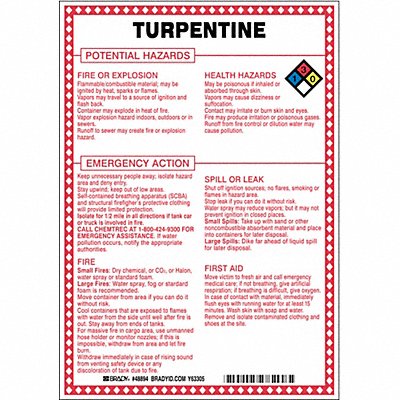 Chemical Sign Turpentine Potential Hazards Fiberglass Height 10 In. Width 7 In. Header No Header Legend Style Symbol and Text Language English Mounting Style Surface Thickness 0.100 In. Sign Shape Rectangle Operating Temp Range -40 Degrees to 194 Degrees F Retroreflective Grade Not Retroreflective