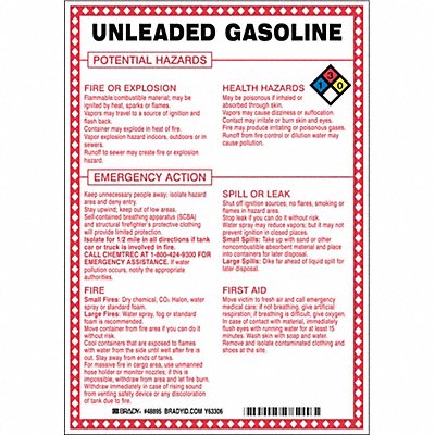Chemical Sign Unleaded Gasoline Potential Hazards Fiberglass Height 10 In. Width 7 In. Header No Header Legend Style Symbol and Text Language English Mounting Style Surface Thickness 0.100 In. Sign Shape Rectangle Operating Temp Range -40 Degrees to 194 Degrees F Retroreflective Grade Not Retroreflective