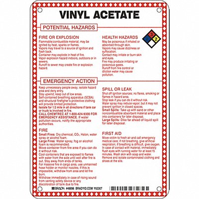 Chemical Sign Vinyl Acetate Potential Hazards Fiberglass Height 10 In. Width 7 In. Header No Header Legend Style Symbol and Text Language English Mounting Style Surface Thickness 0.100 In. Sign Shape Rectangle Operating Temp Range -40 Degrees to 194 Degrees F Retroreflective Grade Not Retroreflective