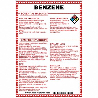 Chemical Sign Benzene Potential Hazards Fiberglass Height 10 In. Width 7 In. Header No Header Legend Style Symbol and Text Language English Mounting Style Surface Thickness 0.100 In. Sign Shape Rectangle Operating Temp Range -40 Degrees to 194 Degrees F Retroreflective Grade Not Retroreflective