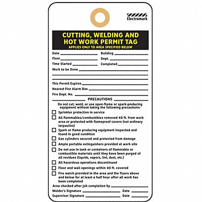 Legend/Background Color Black Yellow/White Cutting Welding and Hot Work Permit Tag Legend Cutting Welding and Hot Work Permit Tag Height 5-3/4 In. Width 3 In. Tag Color White Background Color White Language English Shape Rectangle Header Cutting Welding and Hot Work Permit Tag Tag Material Cardstock Subject Matter Lockout Tagout Package Quantity 25