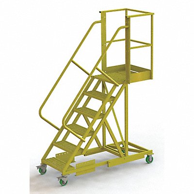 Supported Cantilever Rolling Ladder Material Steel Unassembled Handrails Included Yes Platform Height 60 In. Platform Width 24 In. Platform Depth 20 In. Overall Height 102 In. Load Capacity 300 lb. Handrail Height 42 In. Bottom Width 41 In. Base Depth 72 In. Number of Steps 6 Climbing Angle 50 Degrees Ladder Actuation Locking Casters Step Depth 10 In. Step Width 24 In. Step Tread Serrated Finish Powder Coated Color Yellow Standards OSHA 1910.29 and ANSI A14.7