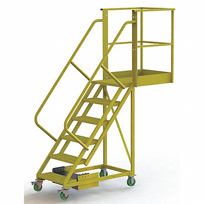 Unsupported Cantilever Rolling Ladder Material Steel Unassembled Handrails Included Yes Platform Height 60 In. Platform Width 24 In. Platform Depth 30 In. Overall Height 102 In. Load Capacity 300 lb. Handrail Height 42 In. Bottom Width 30 In. Base Depth 82 In. Number of Steps 6 Climbing Angle 50 Degrees Ladder Actuation Locking Casters Step Depth 10 In. Step Width 24 In. Step Tread Serrated Finish Powder Coated Color Yellow Standards OSHA 1910.29 and ANSI A14.7