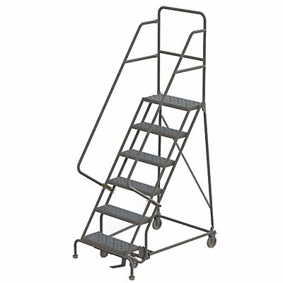 Rolling Ladder Material Steel Platform Height 70 in Handrails Included Yes Handrail Height 36 in Overall Height 106 in Number of Steps 7 Unassembled Load Capacity 450 lb Step Tread Serrated Platform Depth 10 in Platform Width 24 in Bottom Width 35 in Base Depth 57 in Overall Width 35 in Climbing Angle 56 Degrees Step Depth 7 in Step Width 24 in Ladder Actuation Foot Activated Step Lock Finish Powder Coated Color Gray Standards ANSI OSHA Includes 2-1/2 in Rubber Pads