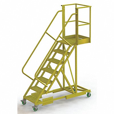 Supported Cantilever Rolling Ladder Material Steel Unassembled Handrails Included Yes Platform Height 70 In. Platform Width 24 In. Platform Depth 20 In. Overall Height 112 In. Load Capacity 300 lb. Handrail Height 42 In. Bottom Width 41 In. Base Depth 81 In. Number of Steps 7 Climbing Angle 50 Degrees Ladder Actuation Locking Casters Step Depth 10 In. Step Width 24 In. Step Tread Serrated Finish Powder Coated Color Yellow Standards OSHA 1910.29 and ANSI A14.7