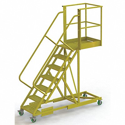 Supported Cantilever Rolling Ladder Material Steel Unassembled Handrails Included Yes Platform Height 70 In. Platform Width 24 In. Platform Depth 30 In. Overall Height 112 In. Load Capacity 300 lb. Handrail Height 42 In. Bottom Width 41 In. Base Depth 91 In. Number of Steps 7 Climbing Angle 50 Degrees Ladder Actuation Locking Casters Step Depth 10 In. Step Width 24 In. Step Tread Serrated Finish Powder Coated Color Yellow Standards OSHA 1910.29 and ANSI A14.7