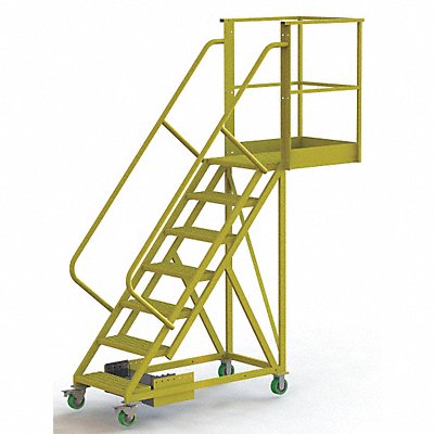 Unsupported Cantilever Rolling Ladder Material Steel Unassembled Handrails Included Yes Platform Height 70 In. Platform Width 24 In. Platform Depth 30 In. Overall Height 112 In. Load Capacity 300 lb. Handrail Height 42 In. Bottom Width 30 In. Base Depth 91 In. Number of Steps 7 Climbing Angle 50 Degrees Ladder Actuation Locking Casters Step Depth 8-1/2 In. Step Width 24 In. Step Tread Perforated Finish Powder Coated Color Yellow Standards OSHA 1910.29 and ANSI A14.7