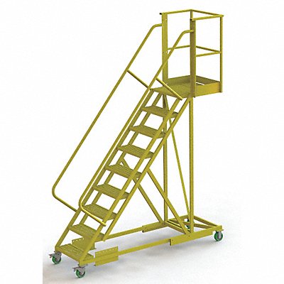 Supported Cantilever Rolling Ladder Material Steel Unassembled Handrails Included Yes Platform Height 90 In. Platform Width 24 In. Platform Depth 20 In. Overall Height 132 In. Load Capacity 300 lb. Handrail Height 42 In. Bottom Width 41 In. Base Depth 97 In. Number of Steps 9 Climbing Angle 50 Degrees Ladder Actuation Locking Casters Step Depth 8-1/2 In. Step Width 24 In. Step Tread Perforated Finish Powder Coated Color Yellow Standards OSHA 1910.29 and ANSI A14.7