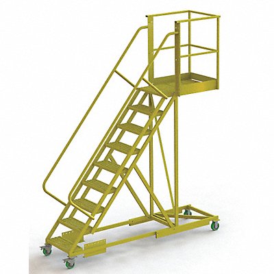 Supported Cantilever Rolling Ladder Material Steel Unassembled Handrails Included Yes Platform Height 90 In. Platform Width 24 In. Platform Depth 30 In. Overall Height 132 In. Load Capacity 300 lb. Handrail Height 42 In. Bottom Width 41 In. Base Depth 107 In. Number of Steps 9 Climbing Angle 50 Degrees Ladder Actuation Locking Casters Step Depth 8-1/2 In. Step Width 24 In. Step Tread Perforated Finish Powder Coated Color Yellow Standards OSHA 1910.29 and ANSI A14.7