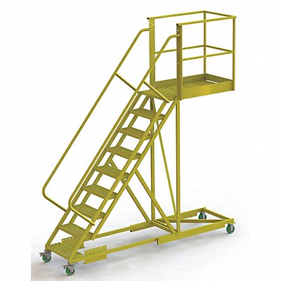 Supported Cantilever Rolling Ladder Material Steel Unassembled Handrails Included Yes Platform Height 90 In. Platform Width 24 In. Platform Depth 40 In. Overall Height 132 In. Load Capacity 300 lb. Handrail Height 42 In. Bottom Width 41 In. Base Depth 117 In. Number of Steps 9 Climbing Angle 50 Degrees Ladder Actuation Locking Casters Step Depth 10 In. Step Width 24 In. Step Tread Serrated Finish Powder Coated Color Yellow Standards OSHA 1910.29 and ANSI A14.7