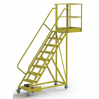 Unsupported Cantilever Rolling Ladder Material Steel Unassembled Handrails Included Yes Platform Height 90 In. Platform Width 24 In. Platform Depth 20 In. Overall Height 132 In. Load Capacity 300 lb. Handrail Height 42 In. Bottom Width 30 In. Base Depth 97 In. Number of Steps 9 Climbing Angle 50 Degrees Ladder Actuation Locking Casters Step Depth 8-1/2 In. Step Width 24 In. Step Tread Perforated Finish Powder Coated Color Yellow Standards OSHA 1910.29 and ANSI A14.7
