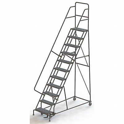 Rolling Ladder Material Steel Platform Height 110 In. Handrails Included Yes Handrail Height 36 In. Overall Height 146 In. Number of Steps 11 Unassembled Load Capacity 450 lb. Step Tread Serrated Platform Depth 10 In. Platform Width 24 In. Bottom Width 35 In. Base Depth 83 In. Overall Width 35 In. Climbing Angle 56 Degrees Step Depth 7 In. Step Width 24 In. Ladder Actuation Foot Activated Step Lock Finish Powder Coated Color Gray Standards OSHA ANSI