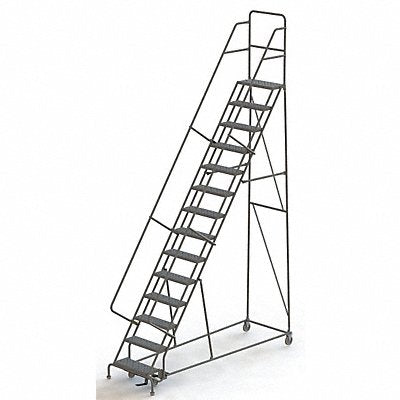 Rolling Ladder Material Steel Platform Height 140 In. Handrails Included Yes Handrail Height 36 In. Overall Height 176 In. Number of Steps 14 Unassembled Load Capacity 450 lb. Step Tread Serrated Platform Depth 10 In. Platform Width 24 In. Bottom Width 40 In. Base Depth 103 In. Overall Width 39 In. Climbing Angle 56 Degrees Step Depth 7 In. Step Width 24 In. Ladder Actuation Foot Activated Step Lock Finish Powder Coated Color Gray Standards OSHA ANSI